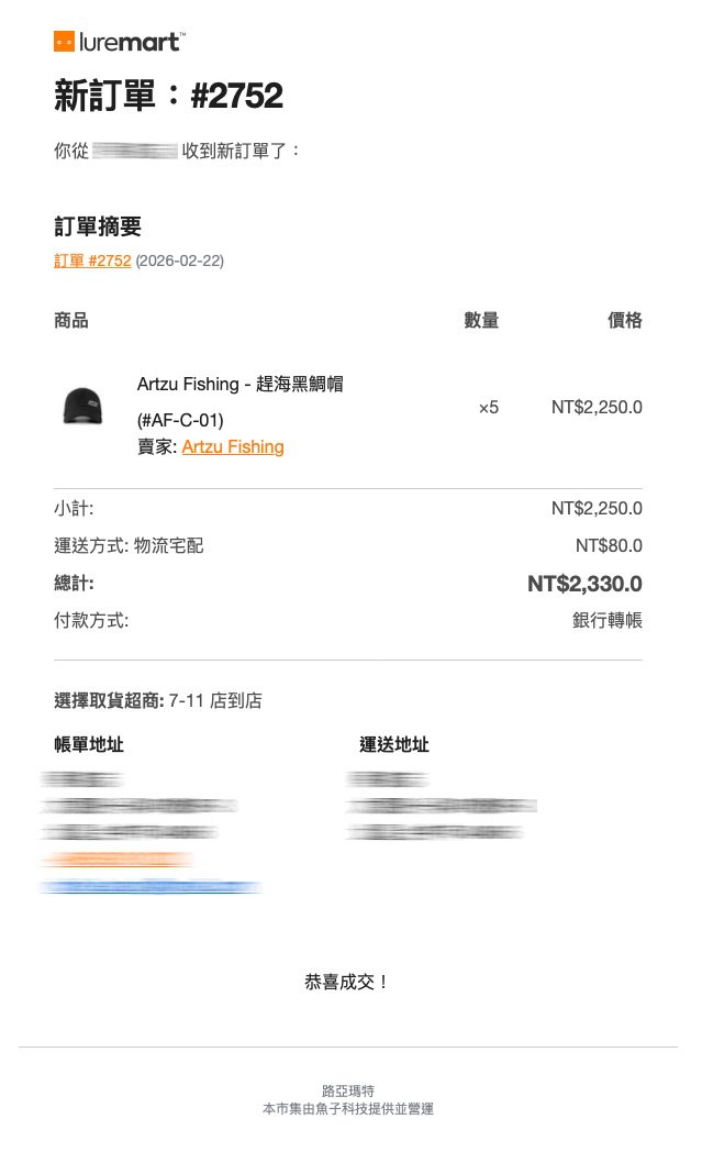 當您的商店有新訂單,系統會發送郵件通知。