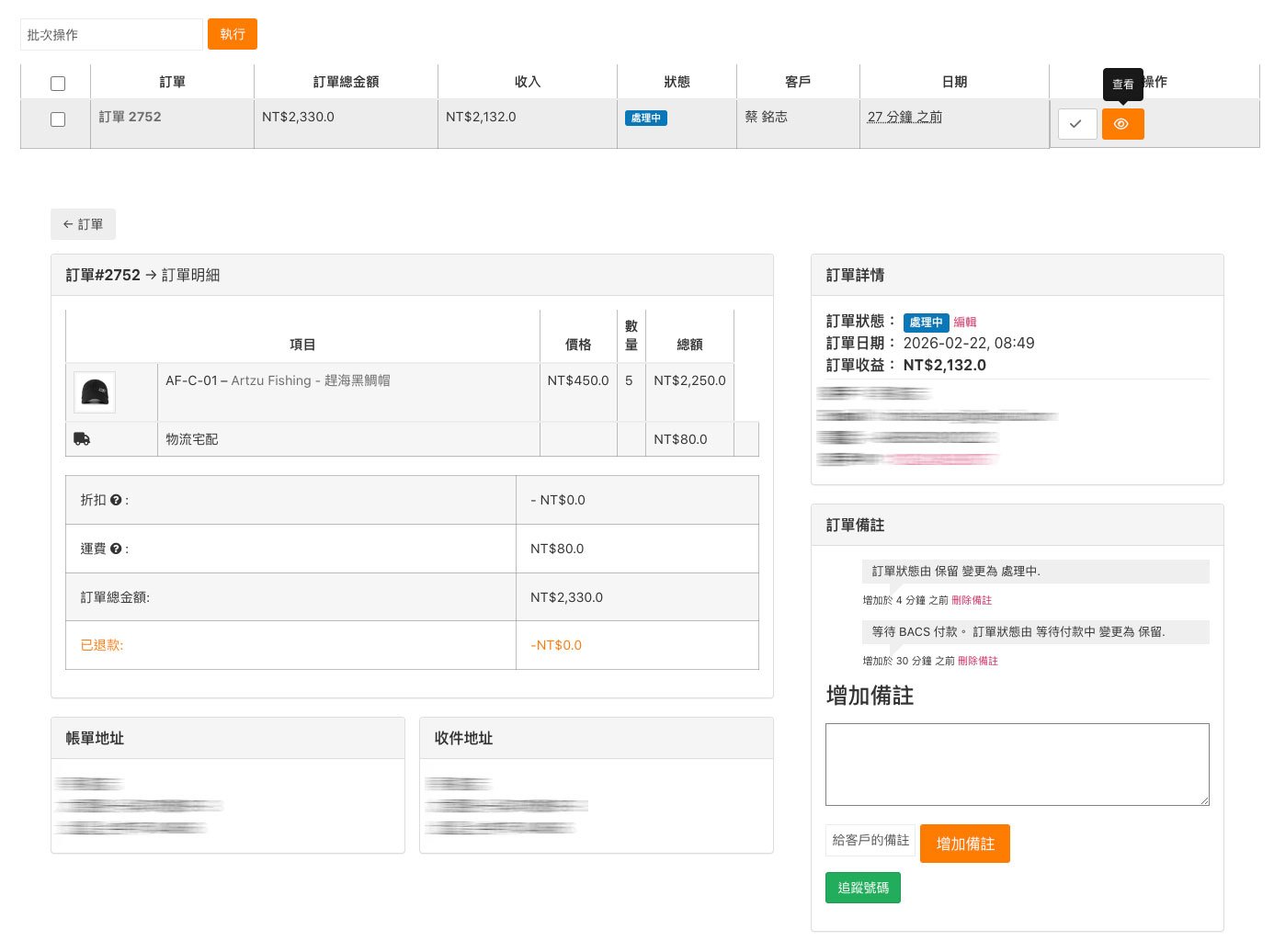 請登入商店儀表板,前往 訂單 頁面。按 訂單編號 或 查看 按鈕,即可瀏覽訂單詳情。