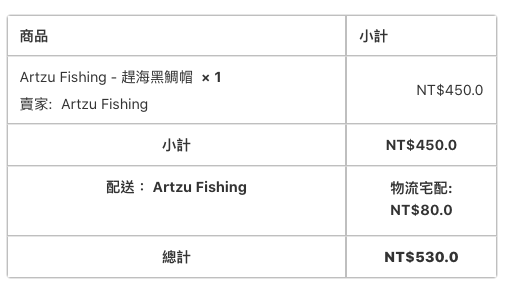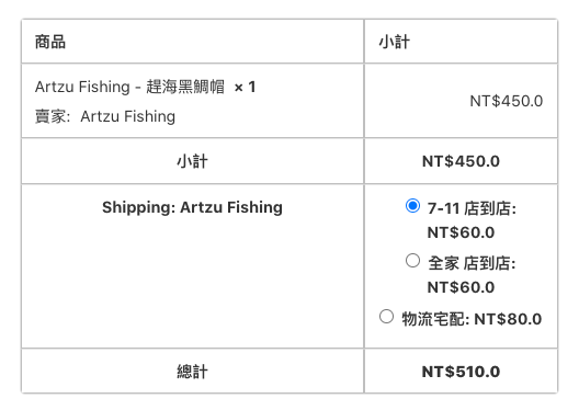 一本釣竿 – 如一本釣竿、竿袋等…費用 450 元。客戶結帳時會隱藏超商店到店的物流方式。