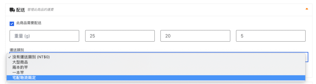 物流宅配方式,有四個運送等級,如果您的商品尺寸無法透過超商店到店配送,請於商品配送區塊選擇相對應的運送類別: